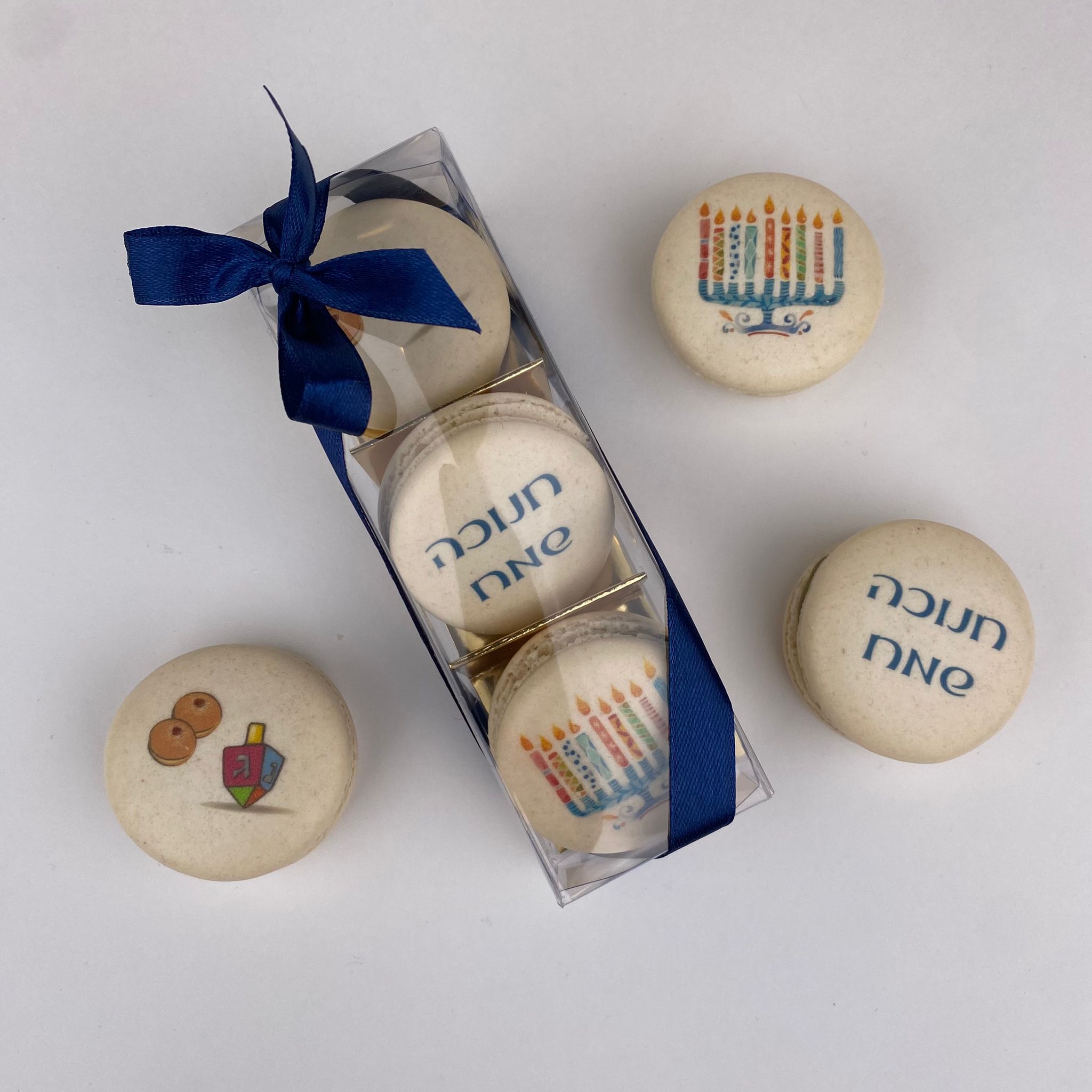האירו את חג האורות עם שלישיית מקרונים לבנים מודפסים בעיצוב חנוכה חגיגי! כל מקרון מגיע עם הדפס ייחודי ברוח החג, ובתוכו מילוי עשיר מתוך מגוון טעמים לבחירה: תות, תות ורדים, מנגו, וניל, לבנדר או פיסטוק. מתנה מתוקה לחג, מושלמת לאירוח, למשפחה או כמתנה מקורית לחנוכה. הזמן עכשיו והפתיעו בטעם ובשמחה חגיגית!