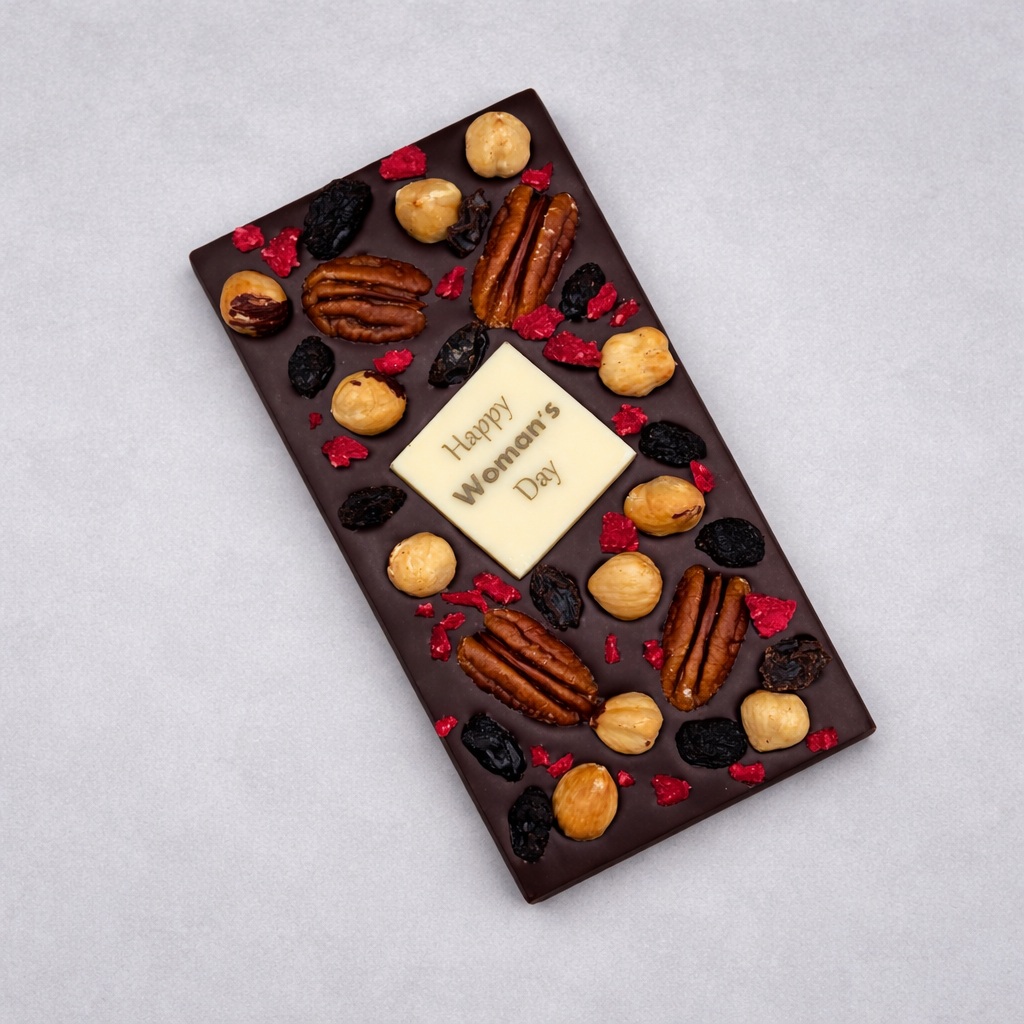 טבלת שוקולד איכותי בעבודת יד – לבחירה שוקולד חלב או מריר 70% – מעוטרת באגוזים ופירות יבשים, ובמרכזה דסקית שוקולד לבן מודפסת בהתאמה אישית: ברכה, שם, לוגו או תמונה.