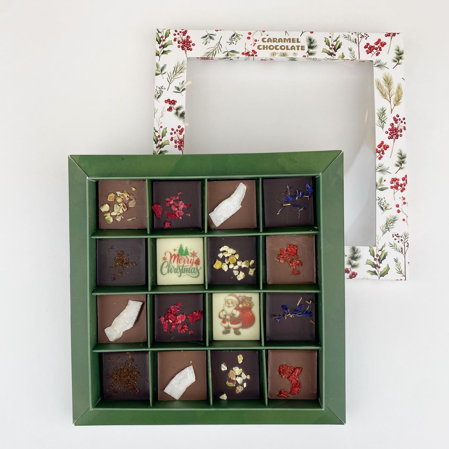 מארז ייחודי של 16 דסקיות שוקולד אכותי – שילוב מושלם של שוקולד לבן, חלב ומריר 70% עם מגוון תוספות מפנקות. שתי דסקיות שוקולד לבן במארז מגיעות עם הדפסה אישית לבחירתכם – לוגו, תמונה או ברכה – מה שהופך את המתנה למרגשת, אישית ובלתי נשכחת.