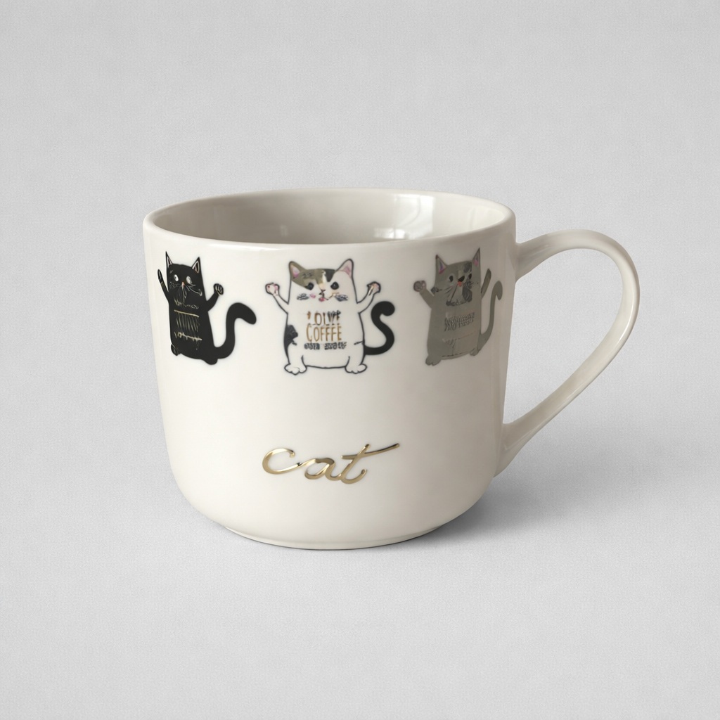 כוס קרמיקה בעיצוב חמוד עם איורי חתולים שובבים ומשעשעים, מושלמת לרגע של קפה, תה או שוקו חם. הספל בנפח 350 מ״ל מתאים לשימוש יומיומי בבית או במשרד ומוסיף נגיעה קלילה ושמחה לשולחן.